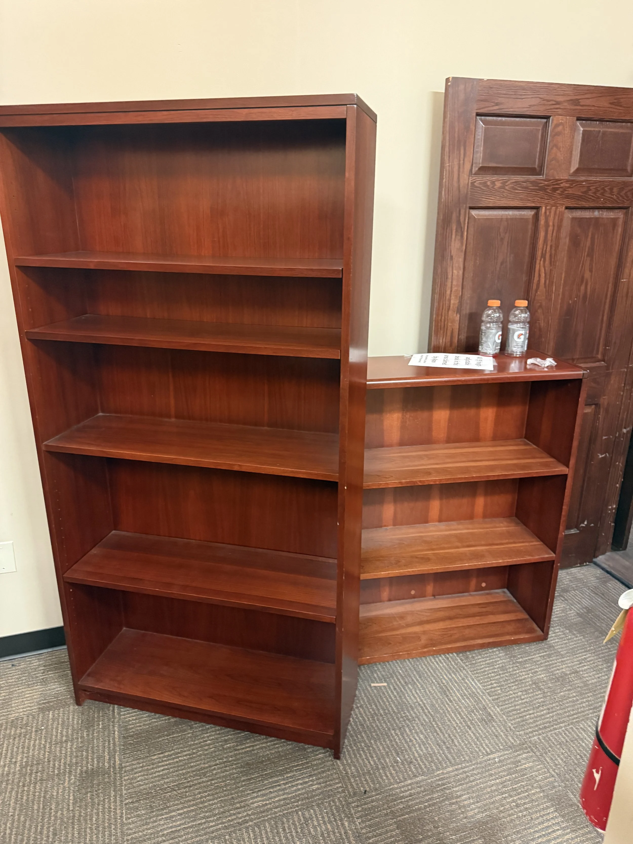 Two wooden bookshelves in an office or storage room, one in the foreground and one in the background, with a beige wall and a fire extinguisher partially visible.