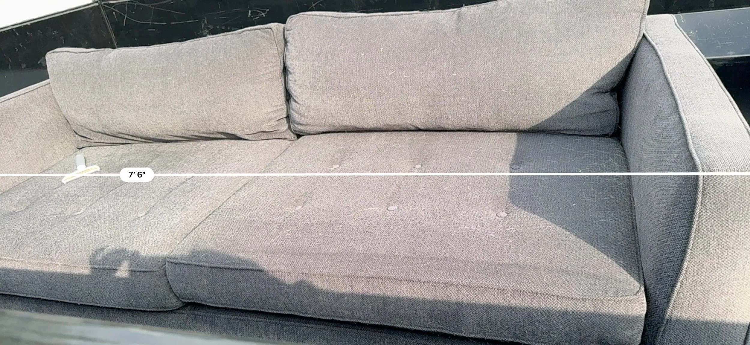 A gray upholstered sofa with two seat cushions, three back cushions, and a left armrest, situated outdoors. There is a measuring tape showing 7 feet 6 inches across the length of the sofa.