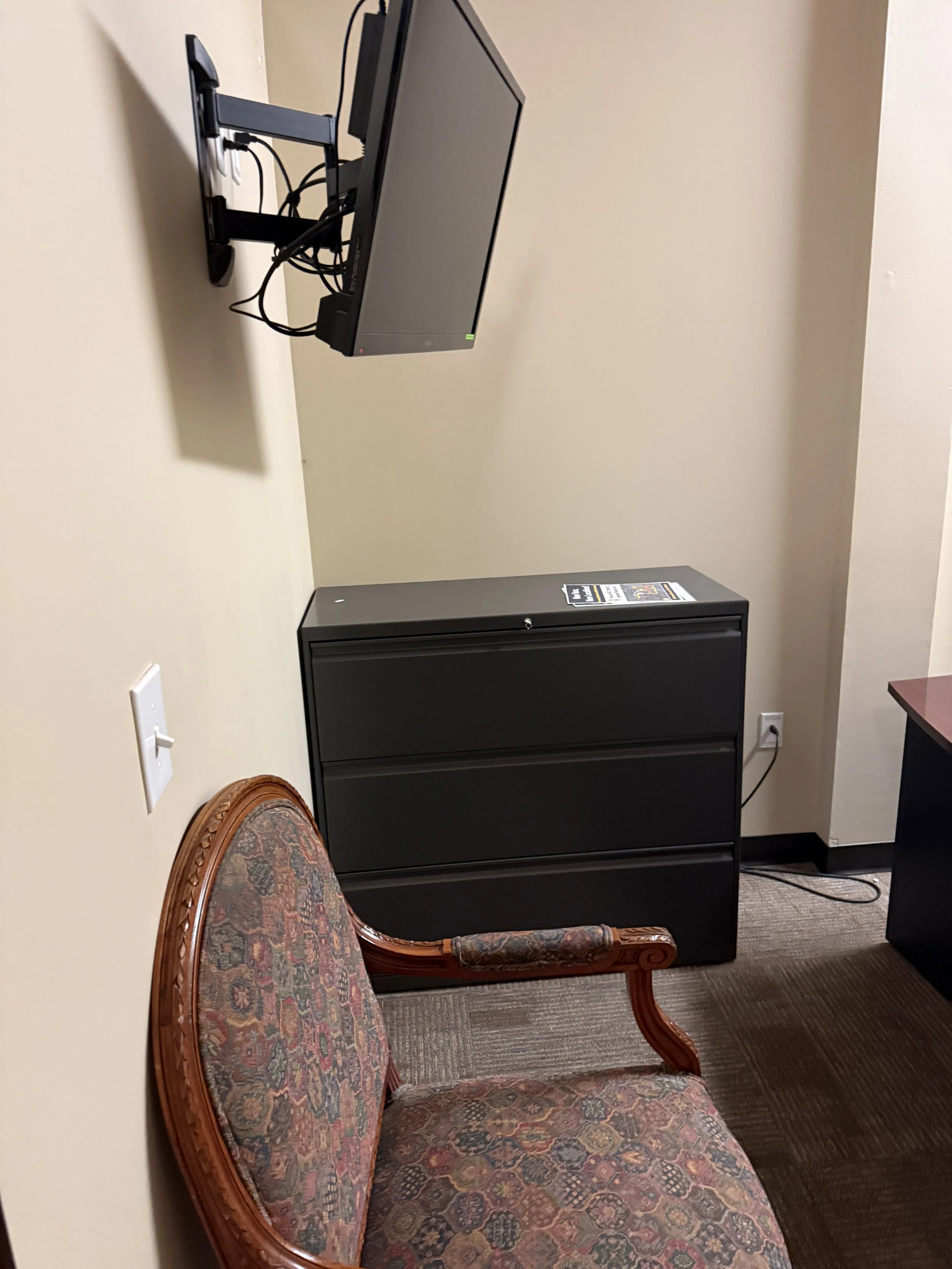 An office corner with a patterned upholstered armchair, a black filing cabinet, a wall-mounted computer monitor, and a power outlet with cords plugged in.